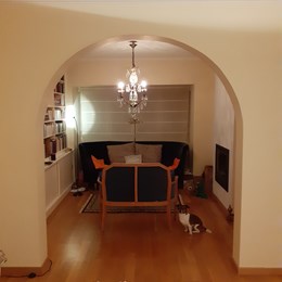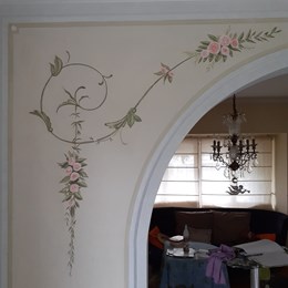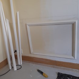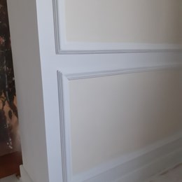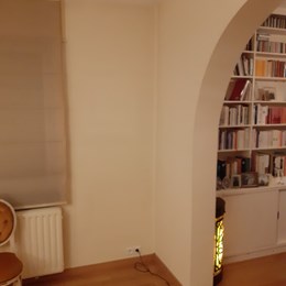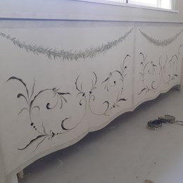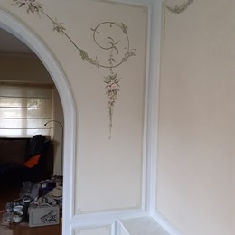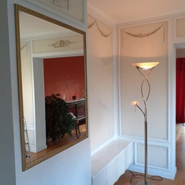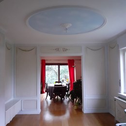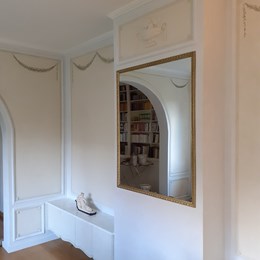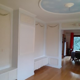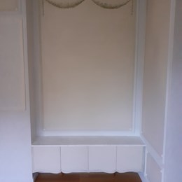 Création et réalisation complète de la décoration Louis XVI, d'une "Chambre" dédiée à la musique ancienne. Des murs aux plafond, moulures en plâtres comprises, marbre peint, ainsi que les meubles et le cache radiateur.