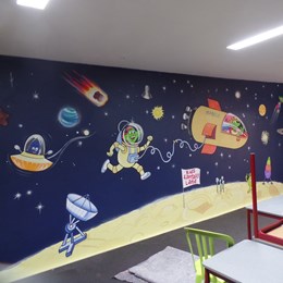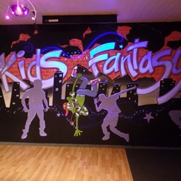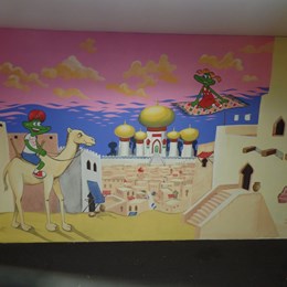 Kids Fantasy Land : Création et réalisation de fresques murales pour chaque salle d’une plaine de jeux couverte, avec les personnages principaux de la plaine de jeux mis en évidence. Parc Indoor Kids Fantasy Land à Linkebeek